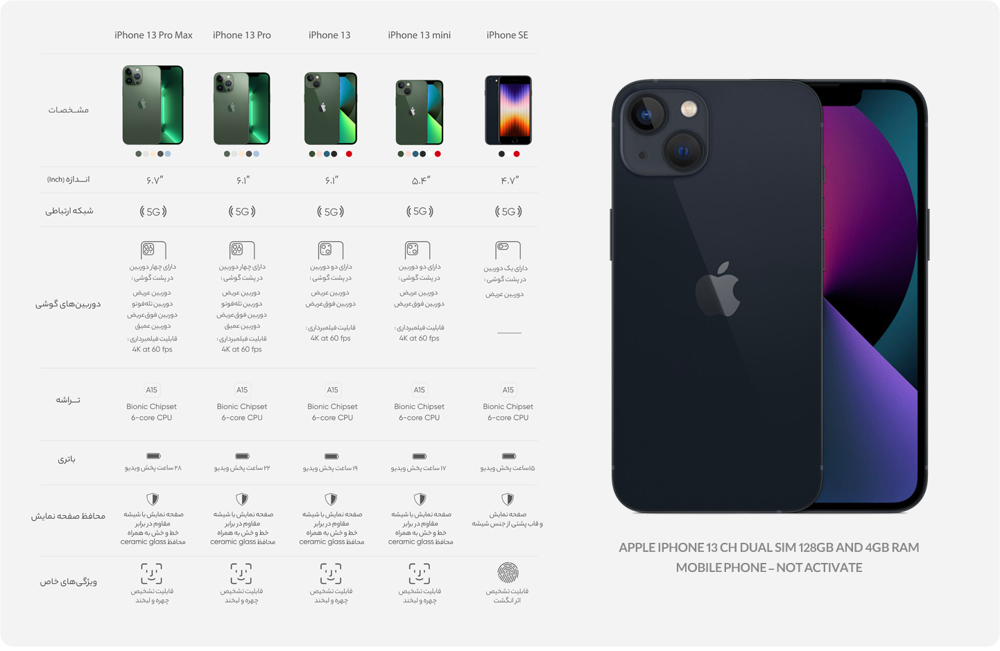 Apple mobile phone Promax model dual SIM card not activeگوشی موبایل iPhone 13 CH پرچمدار جدید شرکت اپل است که با چند ویژگی جدید و دوربین دوگانه روانه بازار شده است. نمایشگر آیفون 13 به پنل Super Retina مجهز شده است تا تصاویر بسیار مطلوبی را به کاربر عرضه کند. این نمایشگر رزولوشن بسیار بالایی دارد؛ بهطوریکه در اندازهی 6.1 اینچیاش، حدود 460 پیکسل را در هر اینچ جا داده است. امکان شارژ بیسیم باتری در این گوشی وجود دارد. تشخیص چهره با استفاده از دوربین جلو دیگر ویژگی است که در آیفون جدید اپل به کار گرفته شده است. از نظر سختافزاری این گوشی از تراشهی جدید A15 بهره میبرد که دارای 15 میلیارد ترانزیستور است که دارای کنترل گرمای مطلوبی بوده که تا بتواند علاوه بر کارهای معمول، از قابلیتهای جدید واقعیت مجازی که اپل این روزها روی آن تمرکز خاصی دارد، پشتیبانی کند. به گفته خود شرکت اپل این گوشی دارای سرعتی 50 برابر نسخه 12 خود است. پردازنده دارای ماژولار جدیدی است که مصرف باتری را بسیار پایینتر آورده است و شما دارای حفظ باتری بالاتری هستید. کیفیت نمایش شما در iPhone 13 دارای 120 هرتز است و کیفیت بالایی را شاهد خواهید بود. اپل در این سری از گوشیهای iPhone خود پردازنده گرافیکیای را قرار داده که از سری 12 گوشیهای خود 30 درصد سریعتر است و این نویدبخش آن است که شما میتوانید بازیهایی را با گرافیک و MAP سنگین تر و بزرگتر اجرا کنید. یکی از ویژگیهایی که در iPhone 13 شاهد هستیم سیستم فیلمبرداری ProRes سینمایی آن است که می تواند انقلابی در فیلمبرداری گوشیهای موبایل بهراه انداخته باشد. گوشیهای نات اکتیو با قرار گرفتن سیمکارتهای داخلی اکتیو میشوند و برخلاف مدل اکتیو پلمپ کالا باز نشده است. گوشیهای اکتیو برند اپل هم به این شکل هستند که به دلیل محدودیتهای برخی از محصولات اپل برای کشور ایران، در کشورهای همسایه بهصورت رسمی با یک بار قرار گرفتن سیمکارت، اکتیو شده و پلمپ میشوند و باید بدانید که این پروسه هیچ مشکلی در راستای گارانتی کالا بههمراه ندارد. پارتنامبرهای اروپا و ژاپن و امارات تک سیمکارت هستند و پارتنامبرهای مربوط به امارات هم از فیس تایم پشتیبانی نمیکنند. پارتنامبر JA (ژاپن) هم حتی در حالت سایلنت صدای شاتر عکس قطع نمیشود.